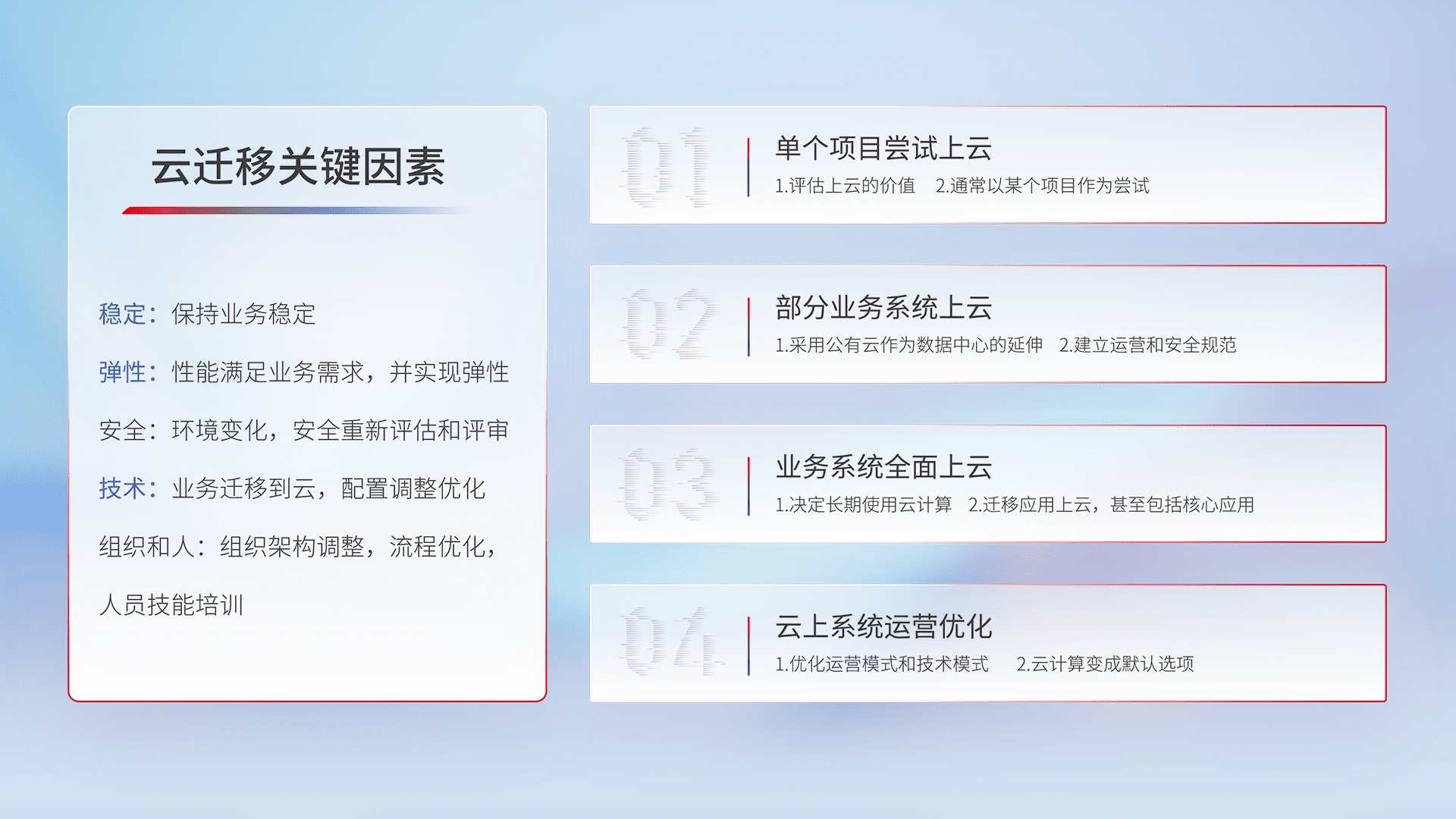 结合实际业务,,,从规划设计、、云平台选型、、、、云原生改造、、、、数据迁移、、集成交付,,,迁移全过程为客户识别最佳上云路径,,,做好风险识别管理,,设计网络架构、、身份权限、、、、安全审计合规、、操作审计、、、、日志审计、、监控告警策略、、、、多站点容灾设计等,,,,对云上基础设施进行整体规划,,,提升IT治理水平,,以满足弹性、、、高可用、、、高性能的需求。。。。
