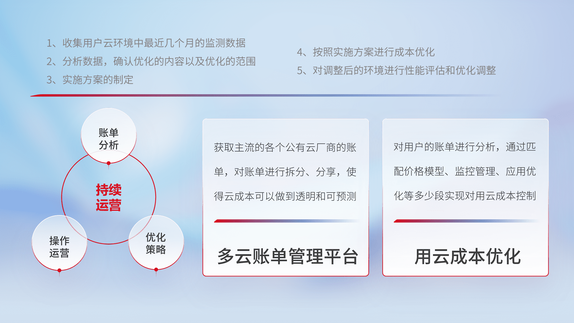 通过多云纳管,,,以统一的资源数据模型把客户的云资源进行抽象和封装,,,进而实现对多云资源的统一操作,,,,保障云资源管理的可靠性、、、稳定性与可用性。。。量身定制化运维内容,,配置、、开发运维、、补丁管理、、备份、、、监控、、认证和访问管理、、、、审计和日常巡检等,,,,保障在用云过程中的可靠度,,,稳定度以及高可用率。。。。